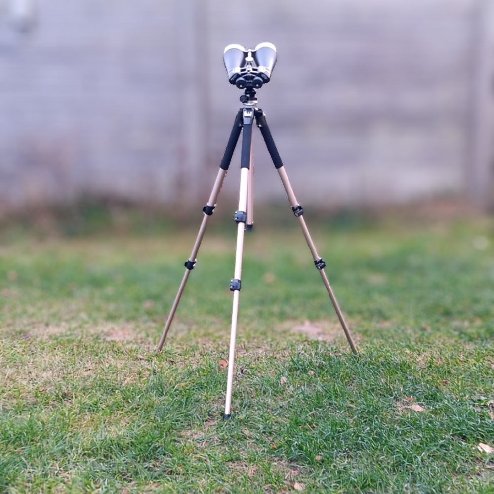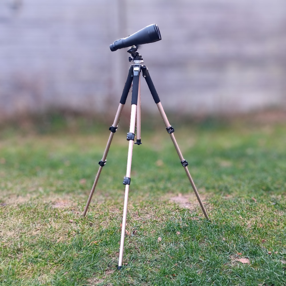 Das Großfernglas wird mit einer Gabelhalterung auf einem massiven Holzstativ von Berlebach verliehen.